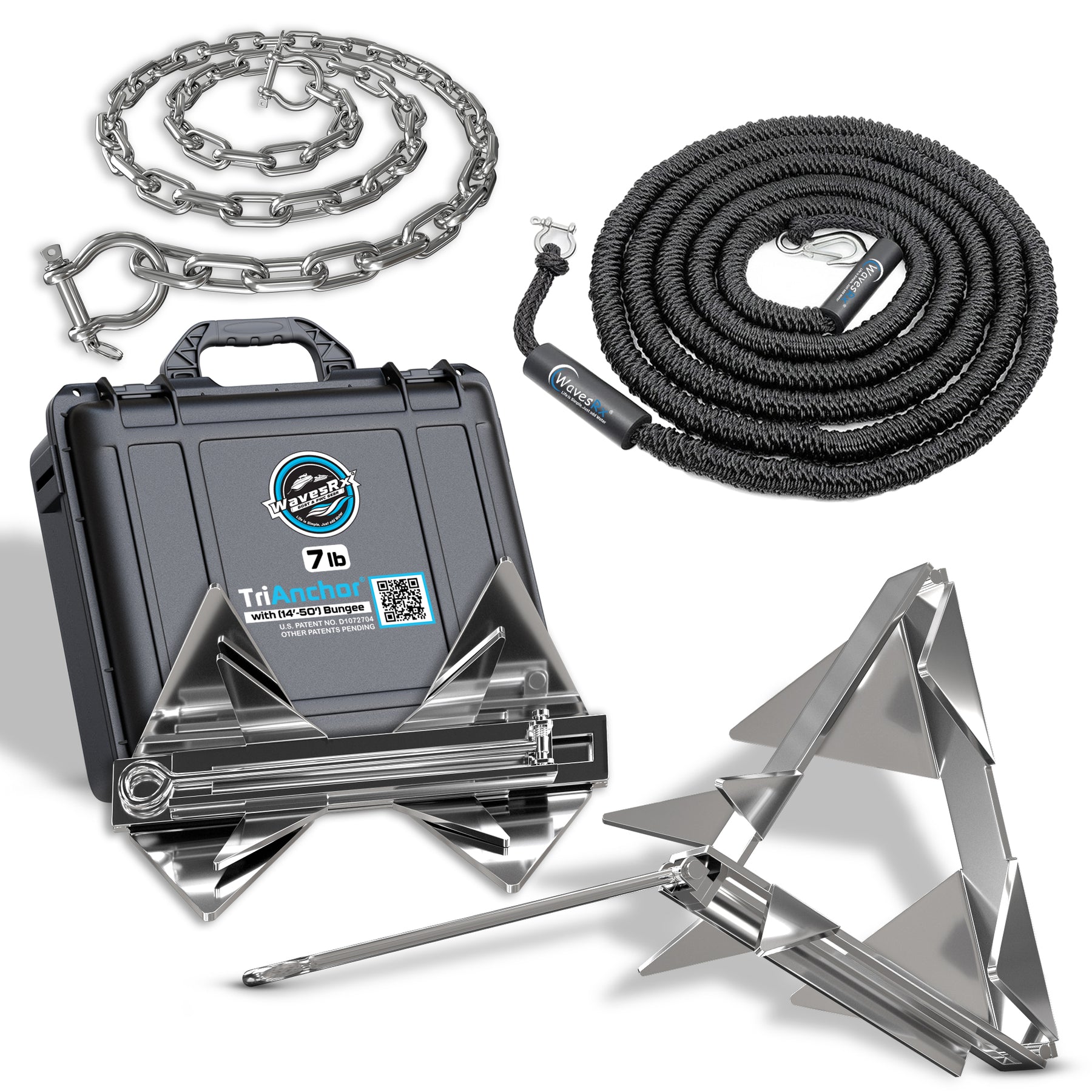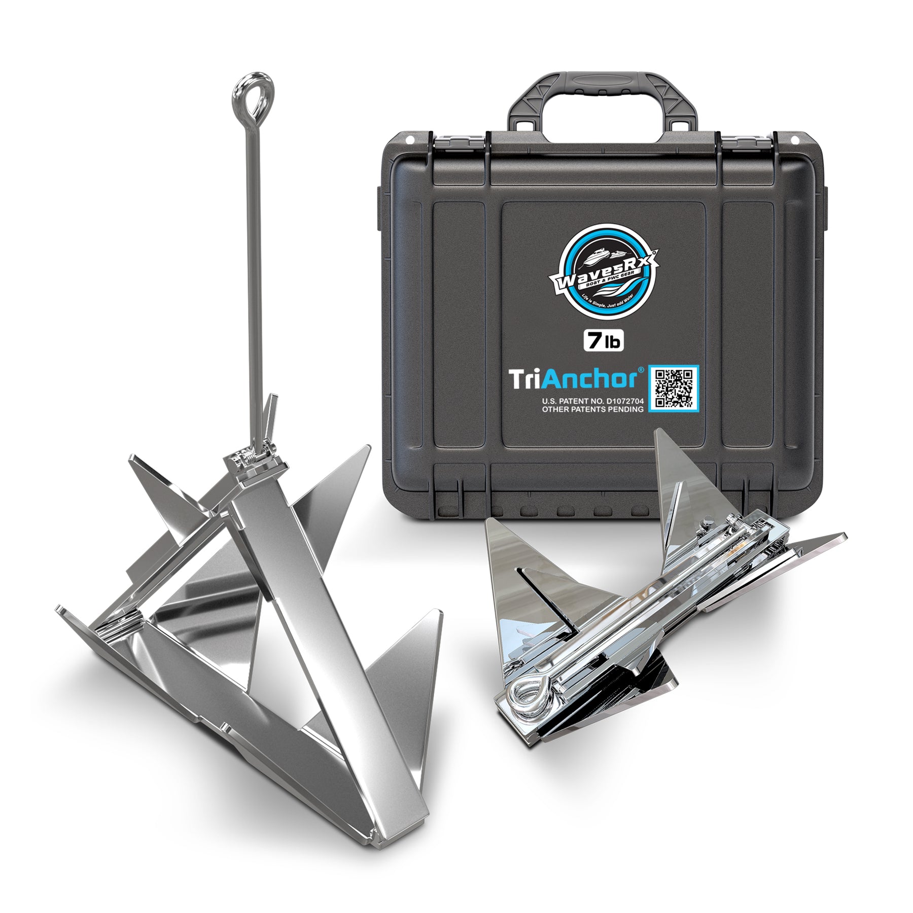 WavesRx Compact Folding Stainless Steel TriAnchor (7 lb) for Anchoring Boats & Pontoons (up to 5,000 lb) I Unique Patent Pending Anchor Design Easily Outperforms Grapnel, Fluke, Mushroom & Box Anchors