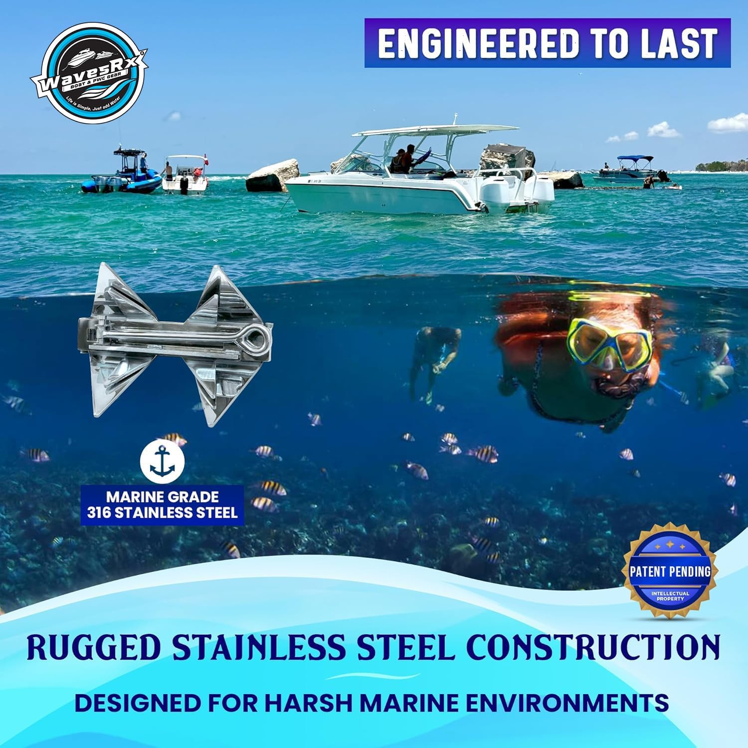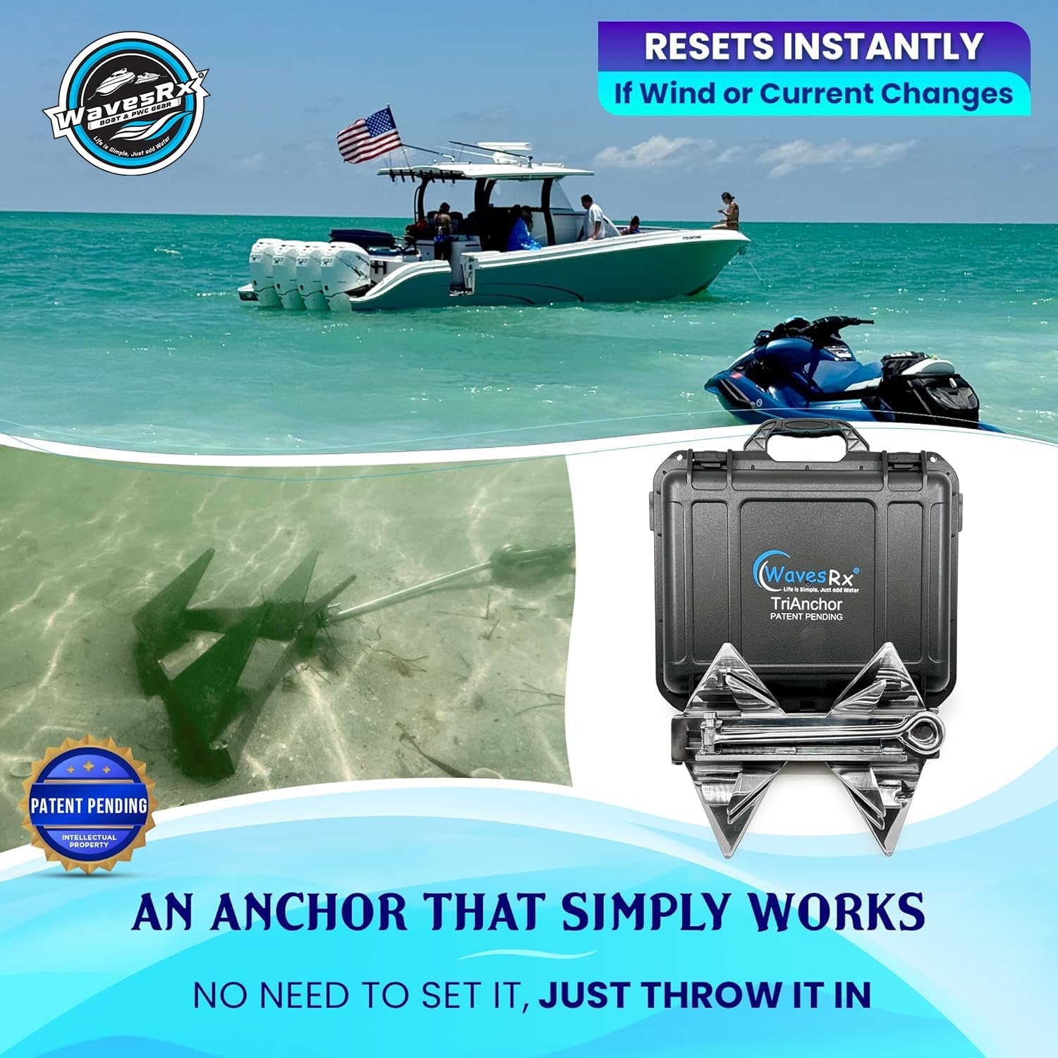WavesRx Compact Folding Stainless Steel TriAnchor (12 lb) for Anchoring Boats & Pontoons (up to 8,000 lb) I Unique Patent Pending Anchor Design Easily Outperforms Grapnel, Fluke, Mushroom & Box Anchors