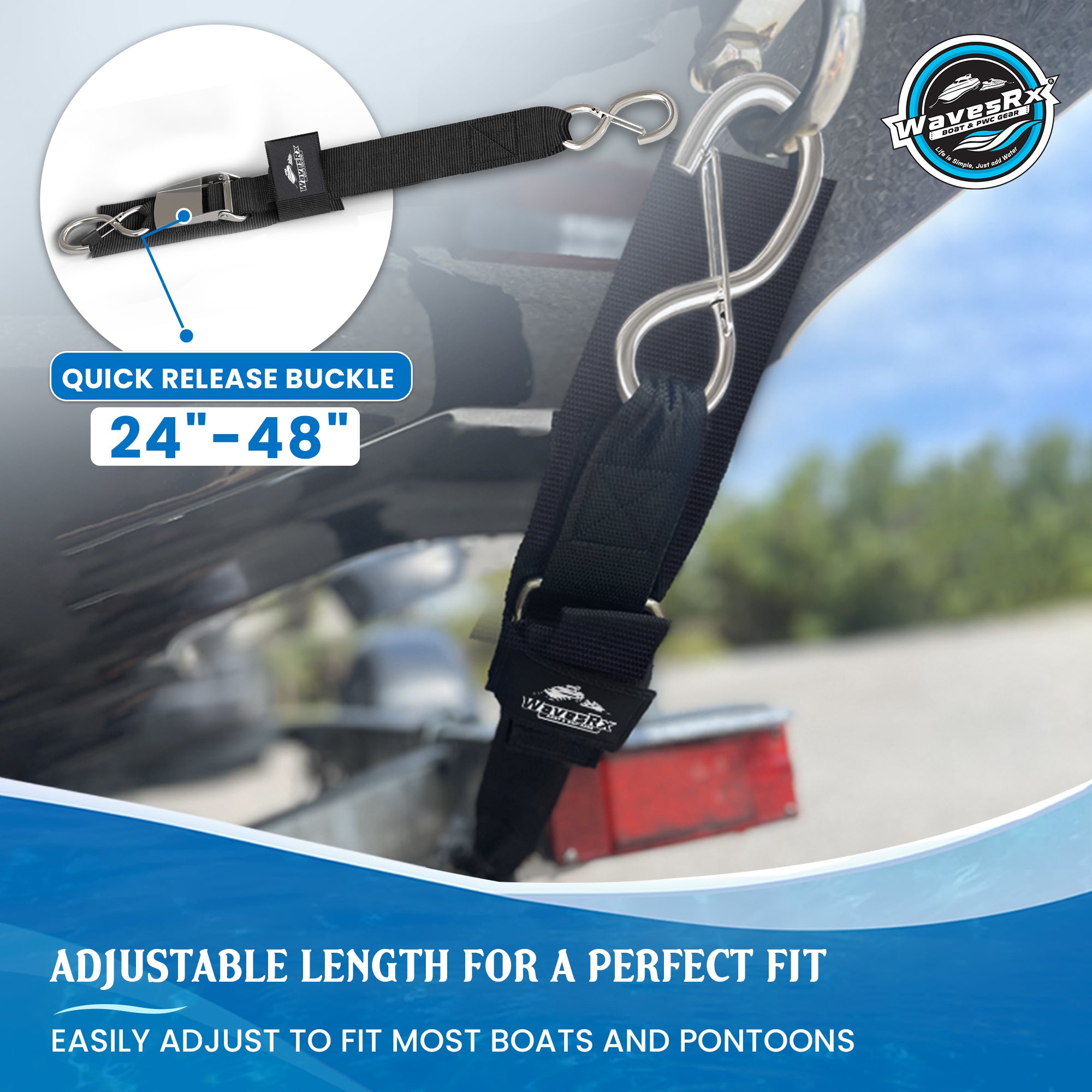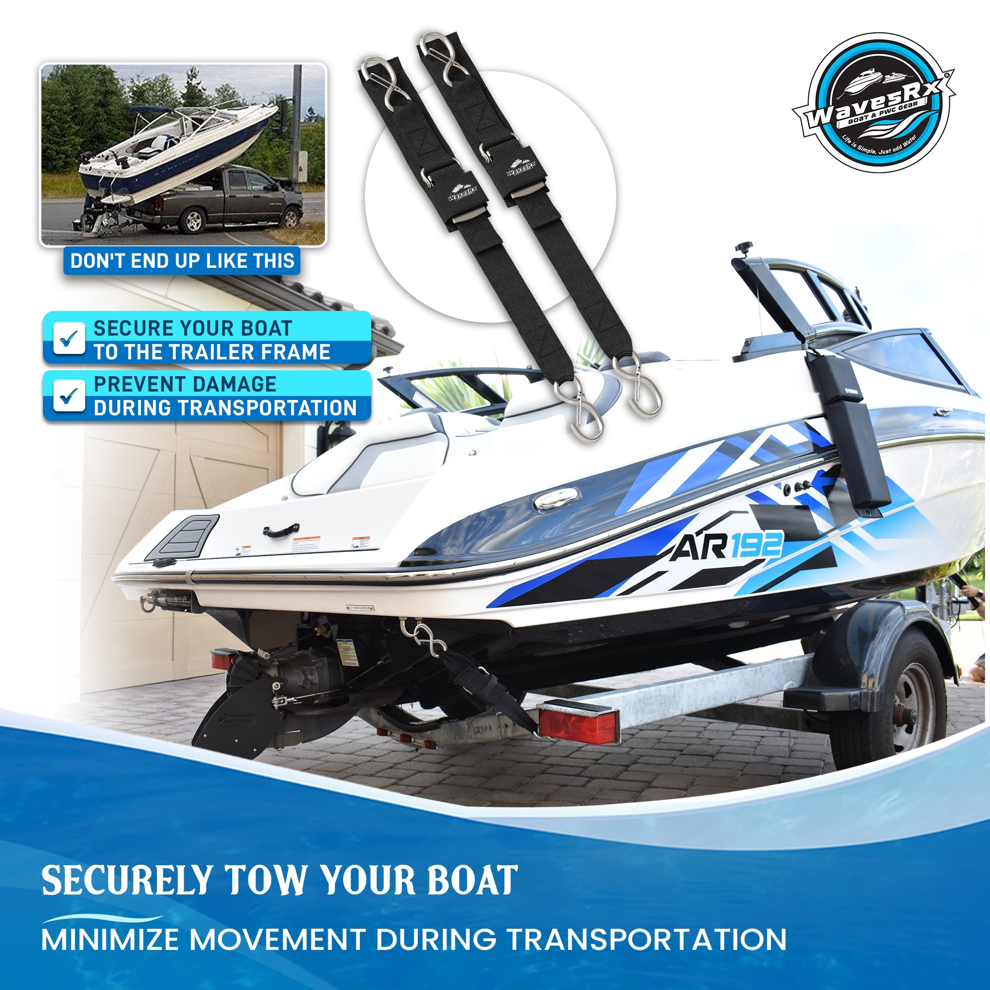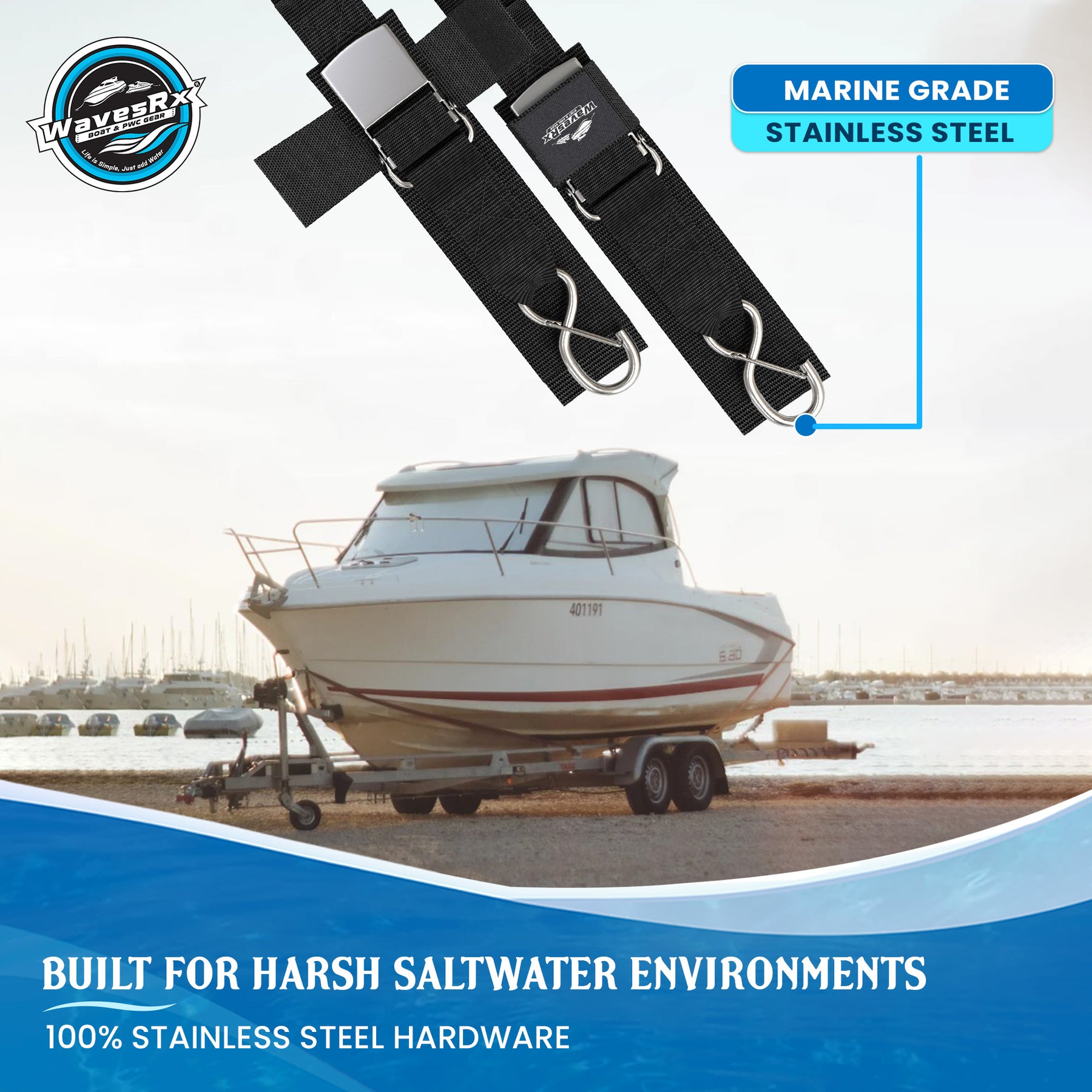 Minimize movement during transportation to prevent damage to your watercraft. MBS: 1,200 lb (545 kg) | WLL: 400 lb (180 kg)