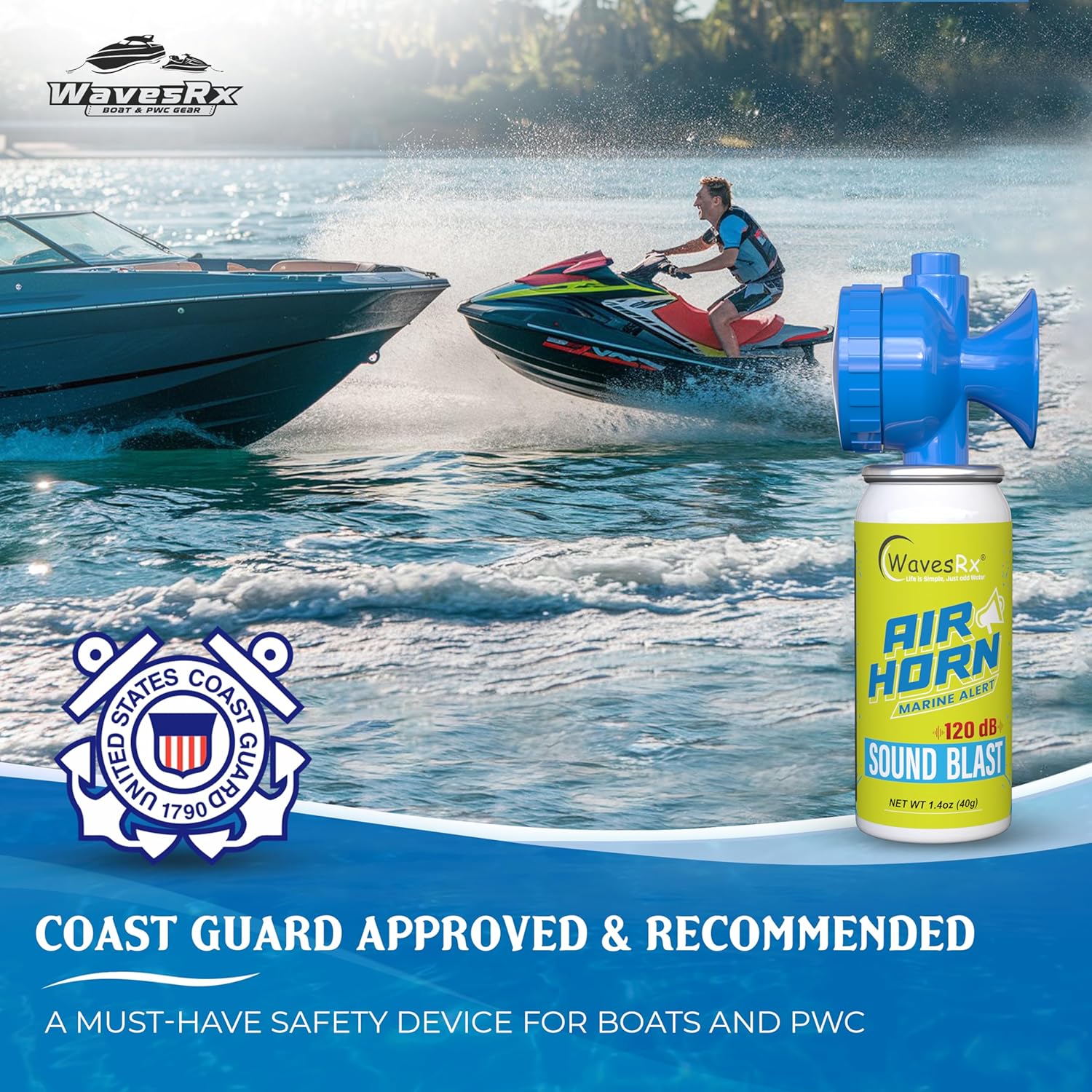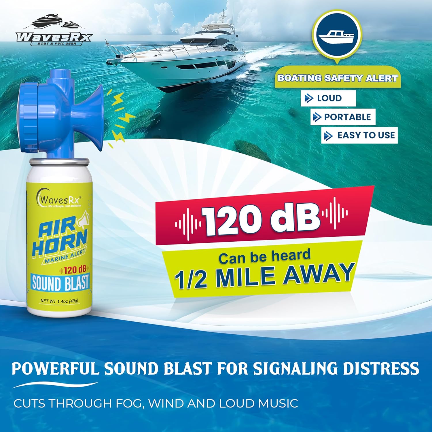 Built for tough marine conditions, the WavesRx Air Horn operates flawlessly in wet and humid salt water environments. Its corrosion-resistant design ensures reliable performance when you need it most, whether for signaling distress or navigating through fog.