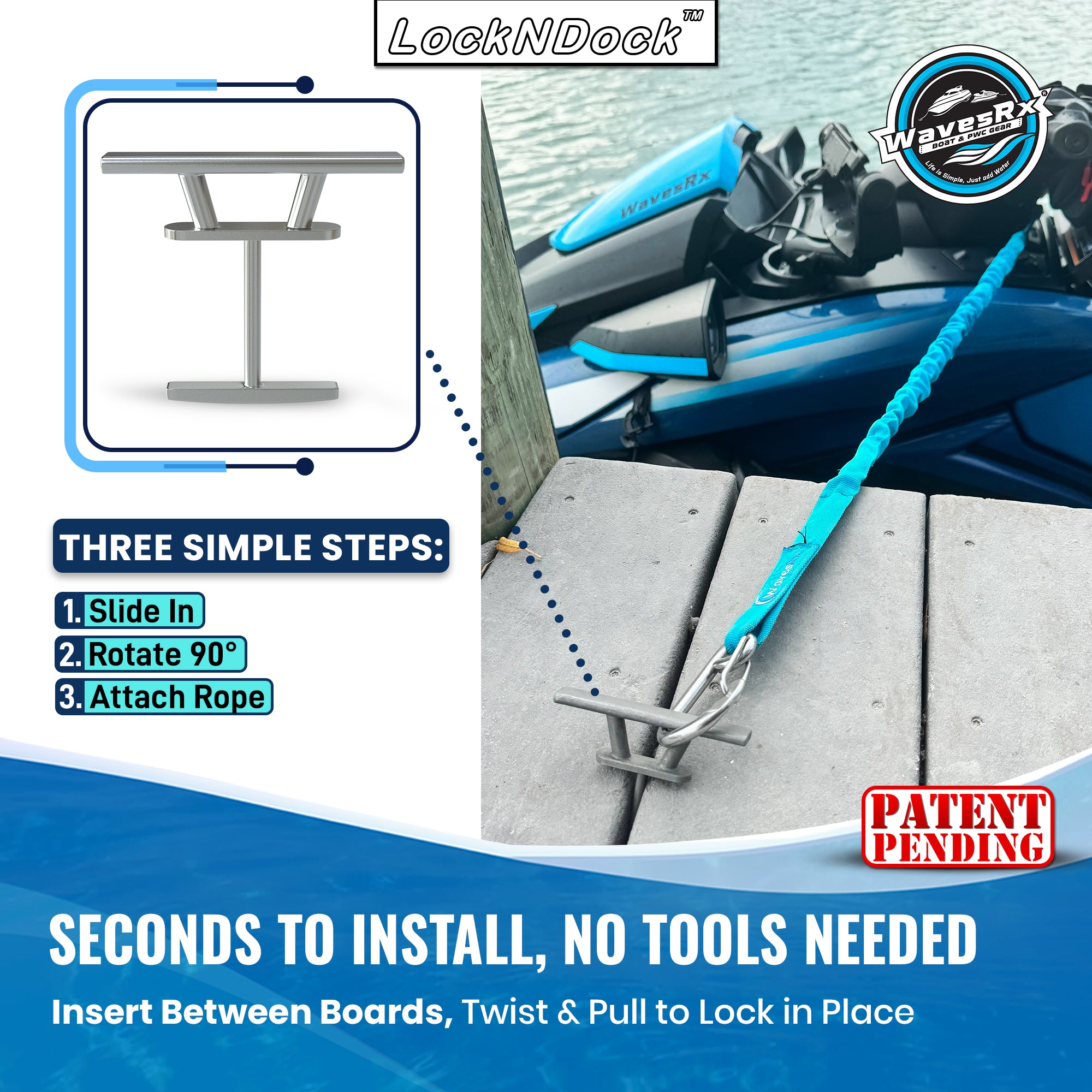 Insert the cleat between dock boards, rotate 90° to lock beneath the dock, then pull toward the dock edge to secure it in place. No tools, drilling, bolts, or permanent hardware required.