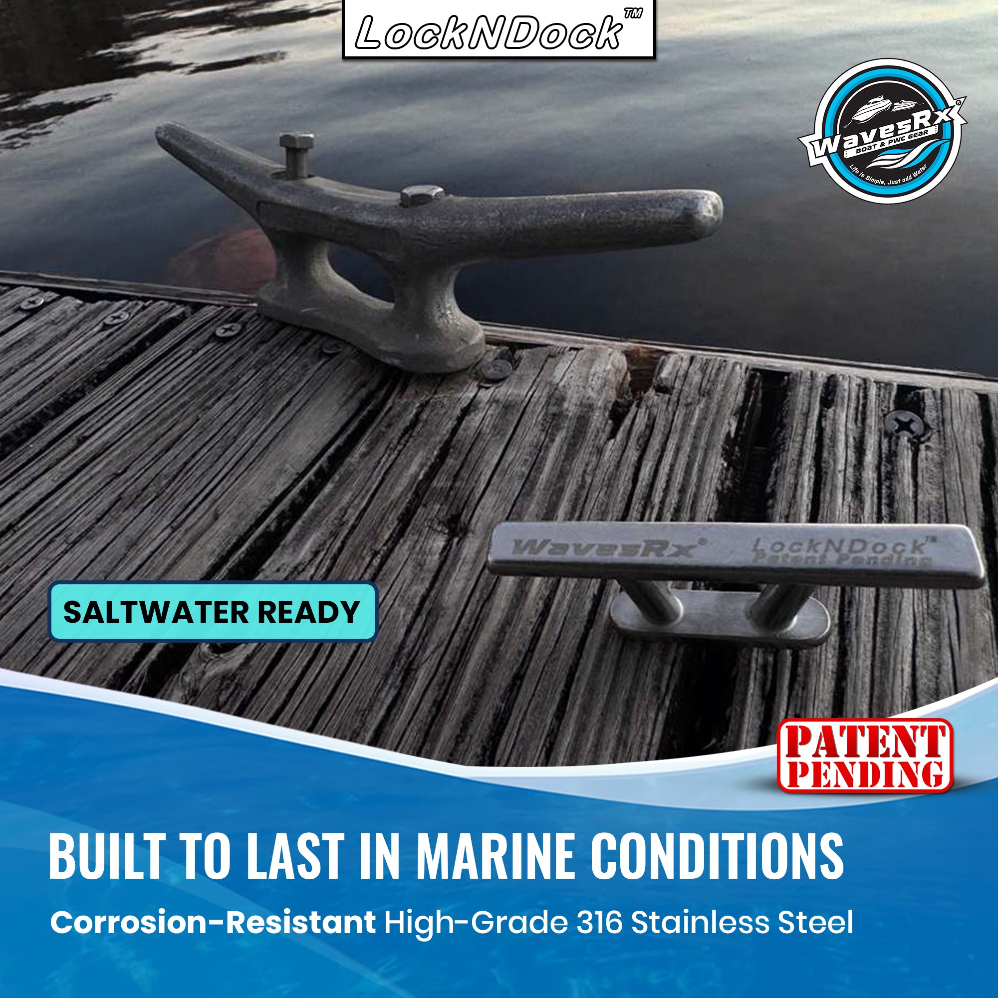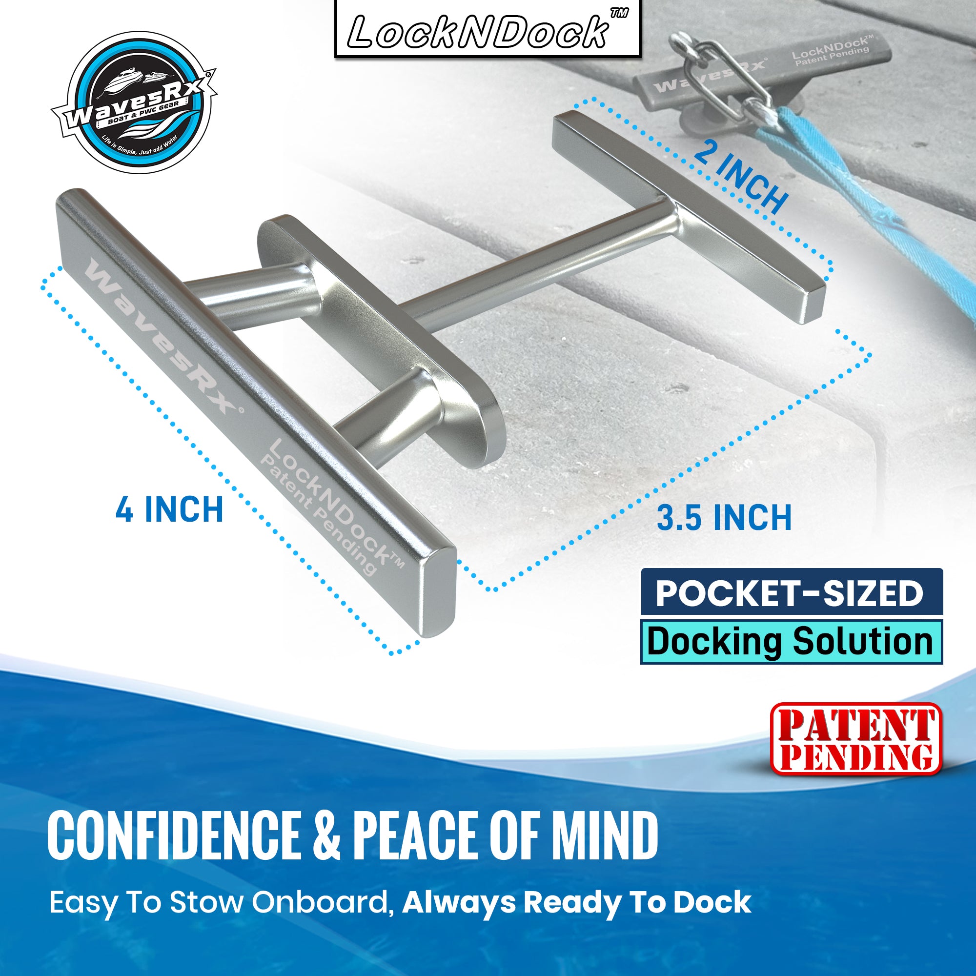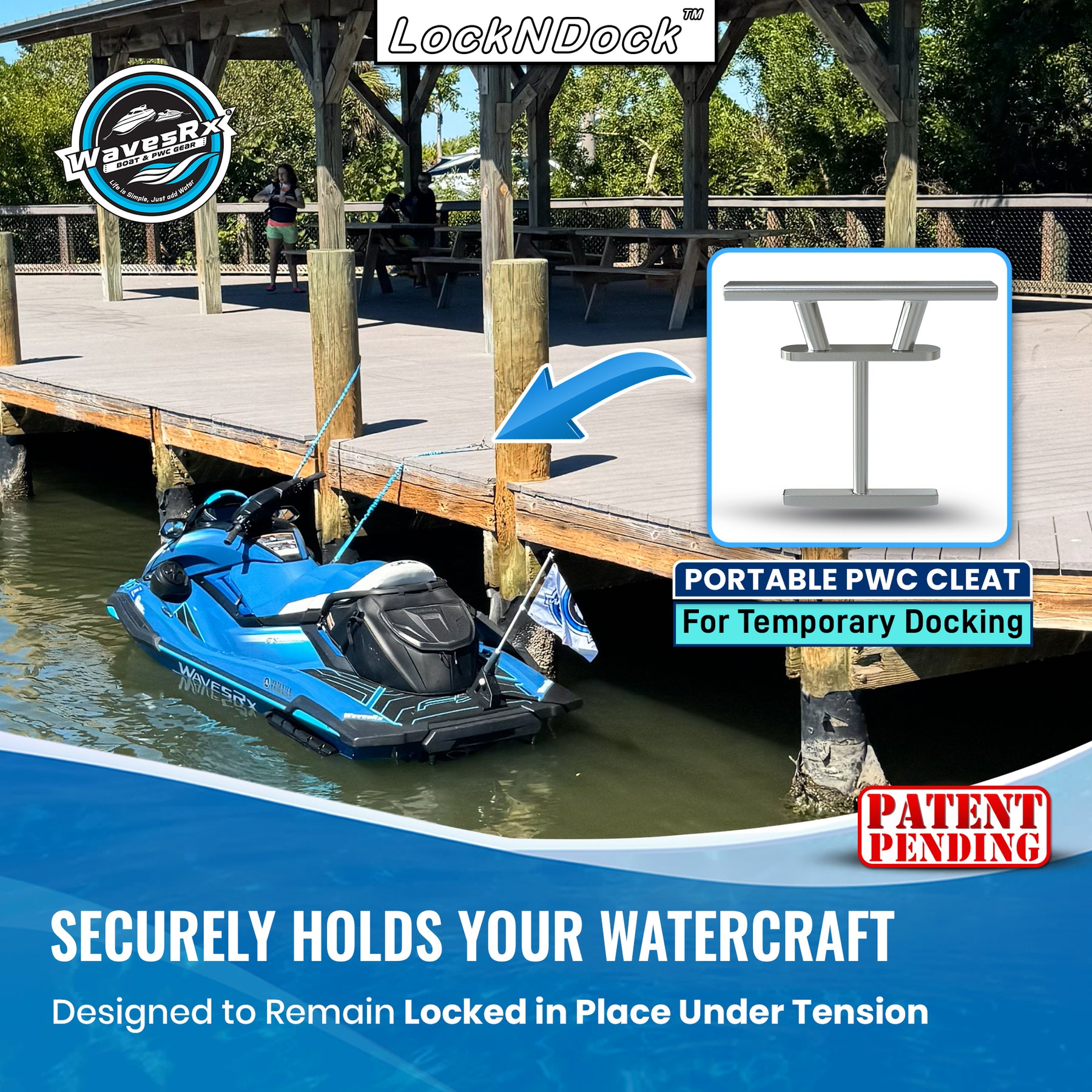 LockNDock™ is a compact, removable docking cleat designed for PWCs and small watercraft when fixed dock cleats are unavailable or out of reach. Provides a simple, reliable tie-off solution wherever you dock.