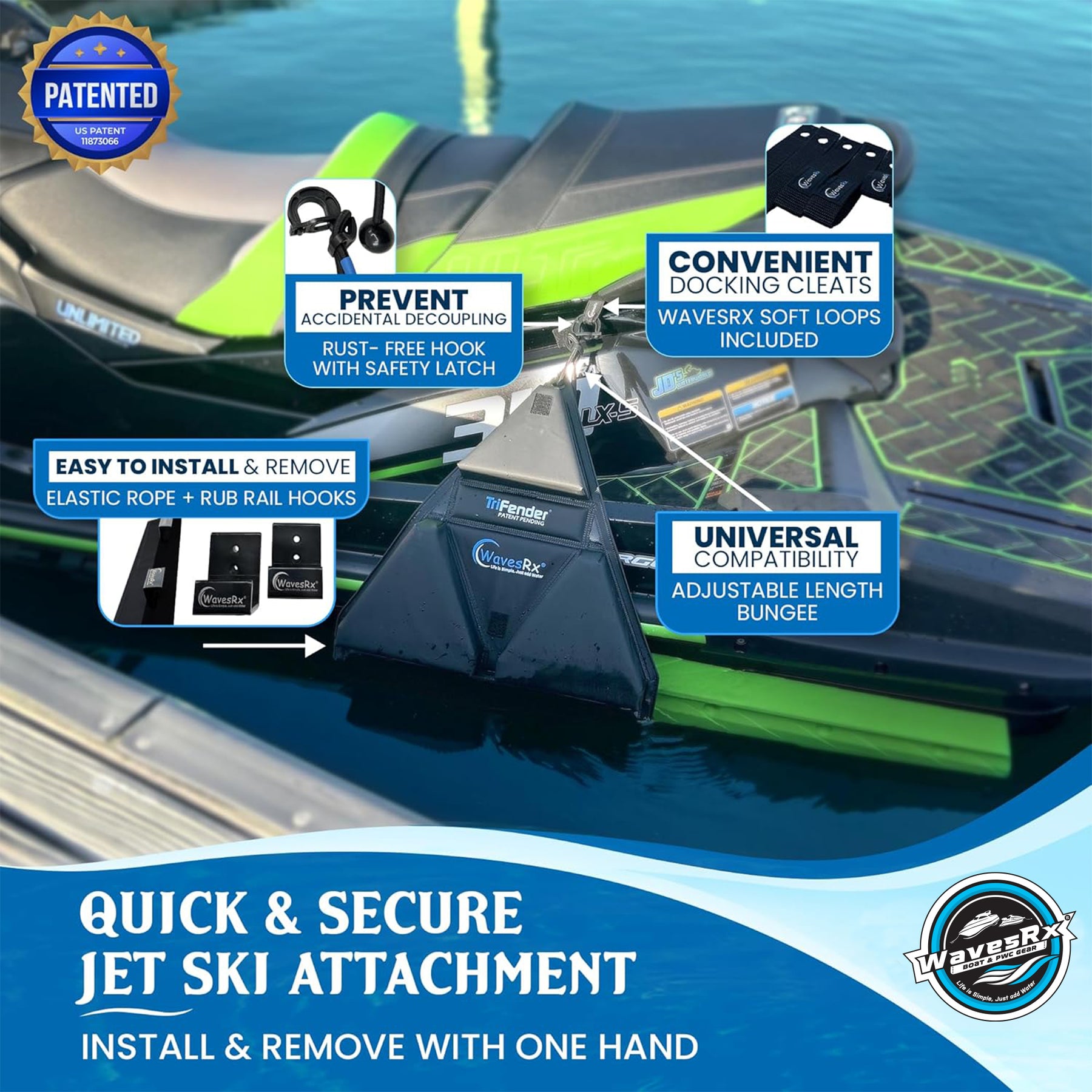 WavesRx PWC Fender Bumper with Soft Loop Cleats for Safe and Convenient Jet Ski Docking. Patented Easy-To-Store Folding Design with Adjustable Bungee Cord Protects Jetski From Dock Rash & Scratches
