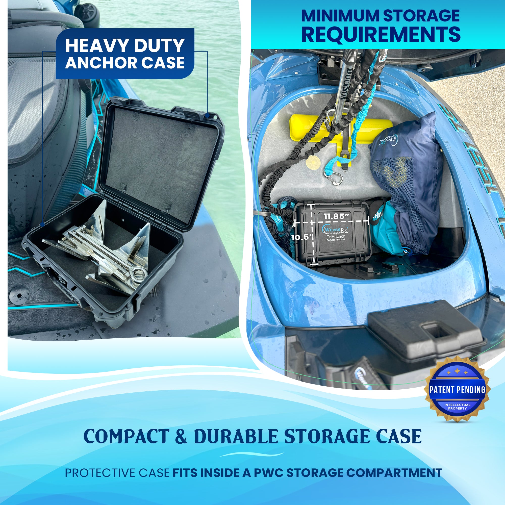Because of the limited storage space on a small watercraft, we designed our TriAnchor to fold flat for Minimum Footprint. It can easily fit inside a jet ski's front storage compartment or under the seat of a small boat. Storage Box: 11.85''x10.5''x5.25'' | Folded Anchor: 9.5”x7”x4” | Assembled Anchor: 9.5”x7”x7.5”hored.