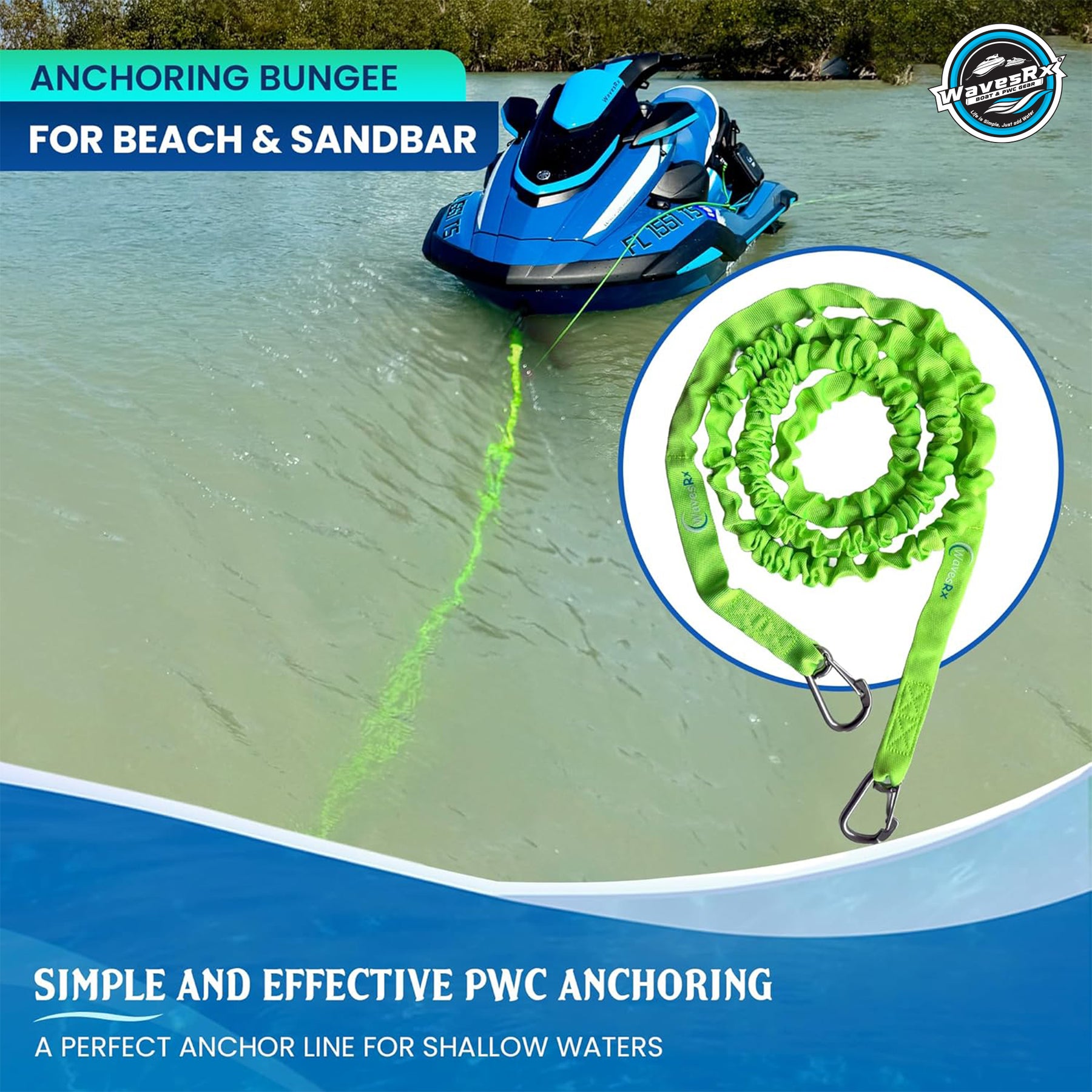 A perfect companion to our WaveCobra Beach Anchor (sold separately), the AnchorMate Flat bungee line Absorbs Sudden Tugs created by wake or surf and prevents your anchor from being dislocated or pulled out.