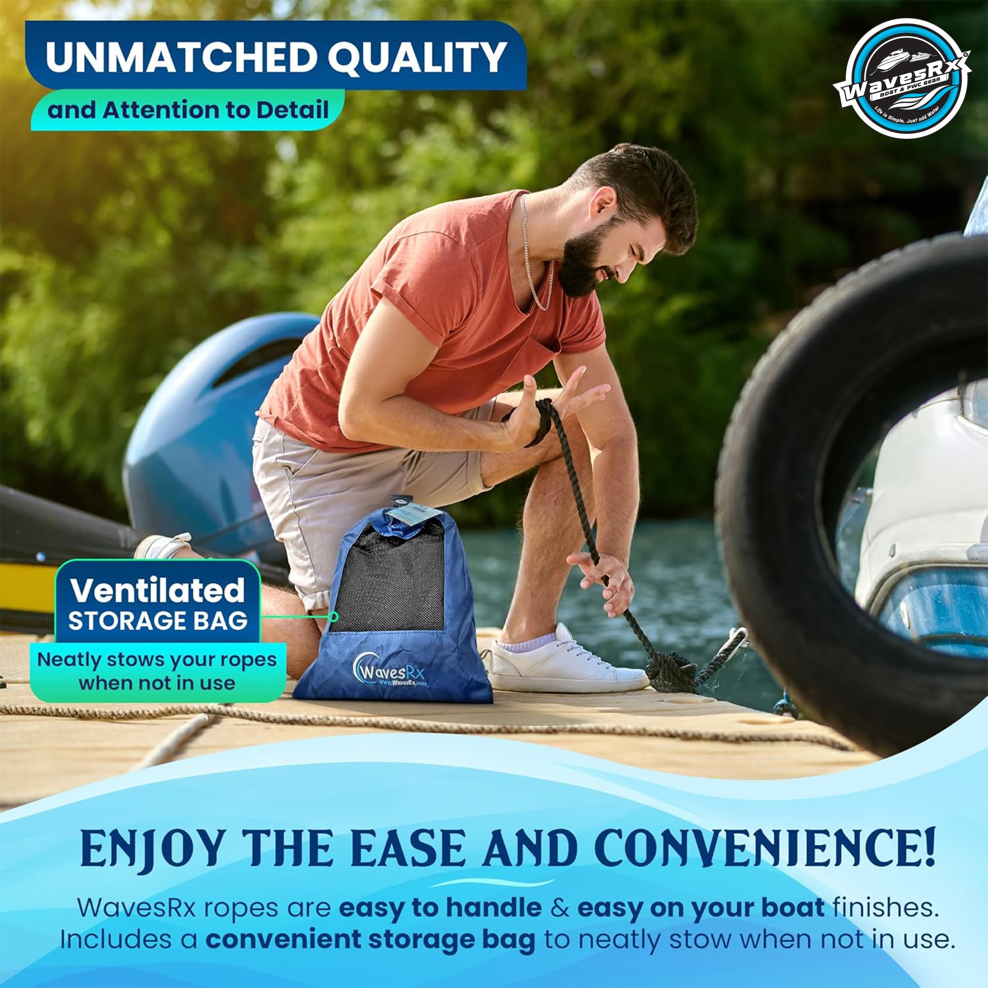 Take a touch test and feel the quality and softness of our ropes - Easy on your Boat Finishes and extremely Comfortable to Handle. SET INCLUDES: 2 Ropes and a FREE durable and convenient Storage Bag to neatly stow your ropes when not in use.